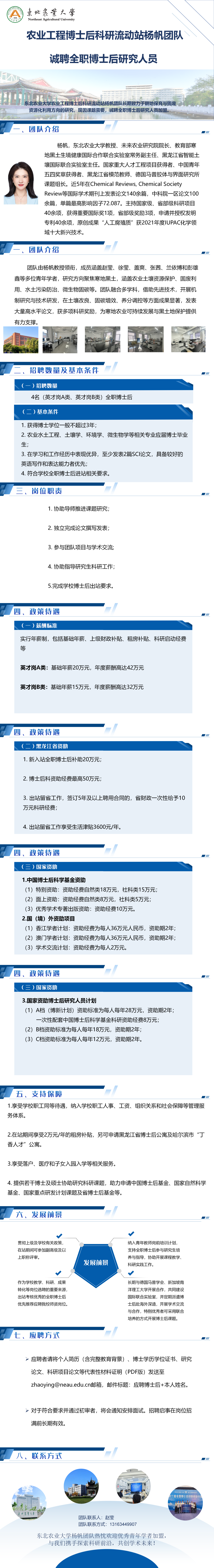 第五期:东北农业大学农业工程博士后科研流动站杨帆团队诚聘全职博士后研究人员